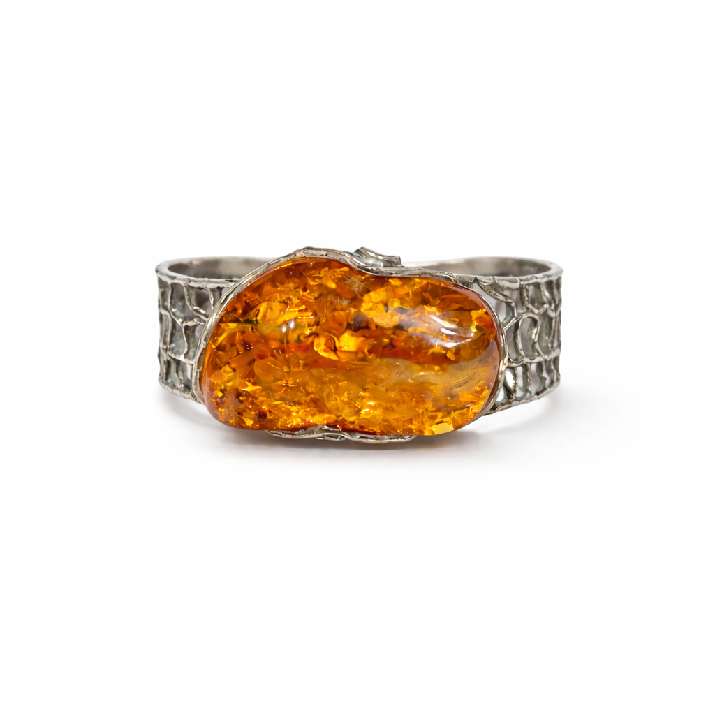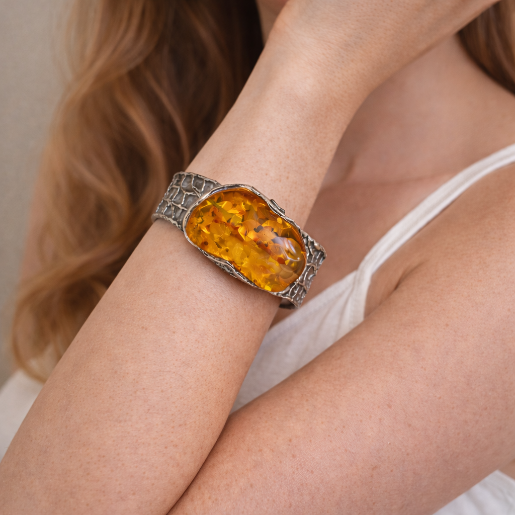 Bursztyn został osadzony w solidnej, srebrnej oprawie, która stabilnie obejmuje kamień i podkreśla jego organiczną formę. Szeroka bransoleta wykonana jest ze srebra o dekoracyjnej, fakturowanej powierzchni inspirowanej strukturami natury, co tworzy spójną i efektowną kompozycję z nieregularnym kształtem bursztynu.
