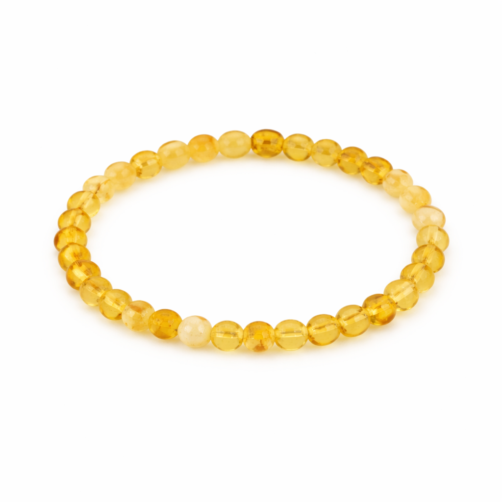 Subtelna bransoletka wykonana z naturalnego bursztynu, nawleczona na elastyczną gumkę, dzięki czemu idealnie dopasowuje się do nadgarstka i zapewnia komfort noszenia. Kuliste bursztynowe koraliki w jasnych, naturalnych odcieniach żółci i miodu zachwycają delikatną przejrzystością oraz unikalnym rysunkiem wewnętrznych inkluzji, charakterystycznych dla prawdziwego bursztynu.