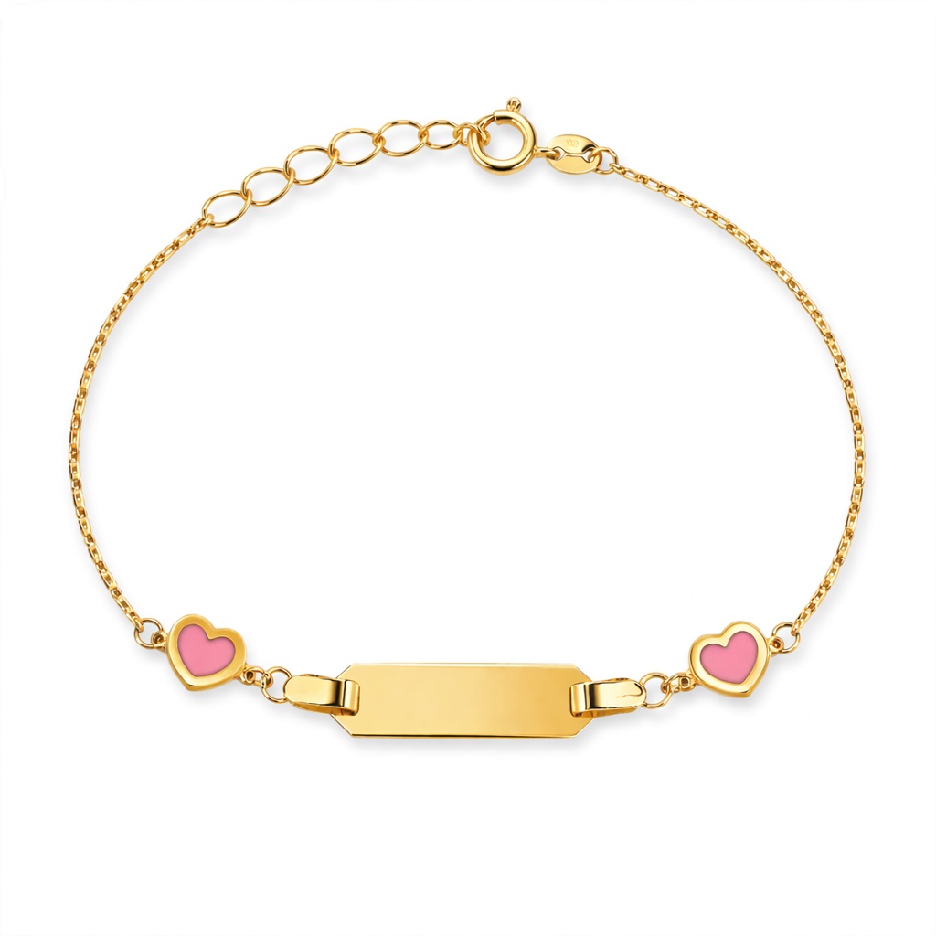 Delikatna bransoletka dla dziewczynki o subtelnym i uroczym charakterze. Ozdobiona serduszkami wypełnionymi różową emalią, które nadają biżuterii lekkości i dziewczęcego uroku. Centralny element tworzy elegancka, gładka blaszka, podkreślająca minimalistyczny i ponadczasowy styl bransoletki. Całość prezentuje się niezwykle harmonijnie i stanowi piękną, symboliczną ozdobę na wyjątkowe chwile.