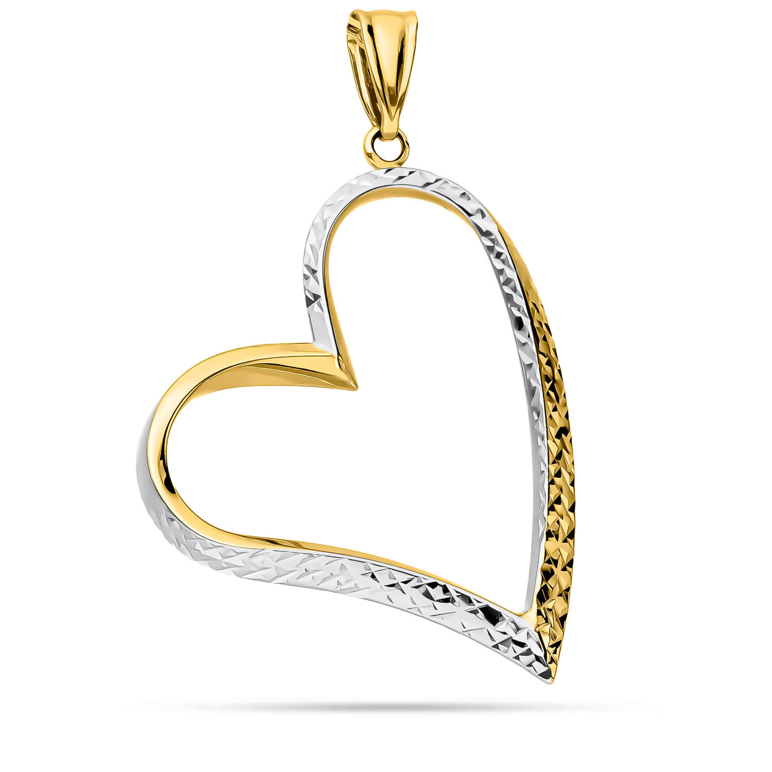 Duża złota zawieszka serce w formie ramki. Gładka powierzchnia wraz z diamentowaną powierzchnią. Wykonana ze złota próby 585. Oryginalny, modny styl. Sprzedawana legalnie z oficjalnej polskiej dystrybucji przez markę ZECCORO. Zapakowana w eleganckie, stylowe pudełko idealnie pasuje jako prezent na każdą okazję.