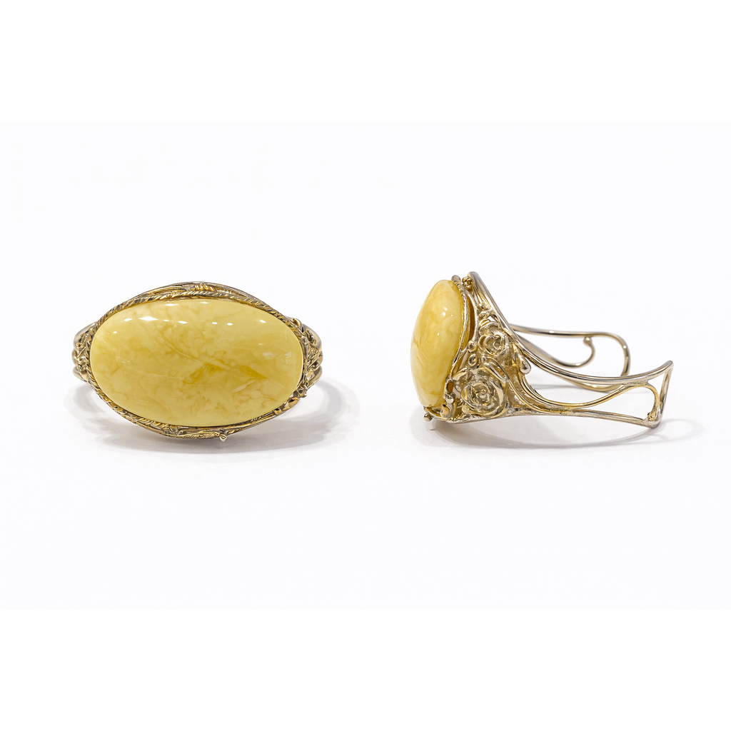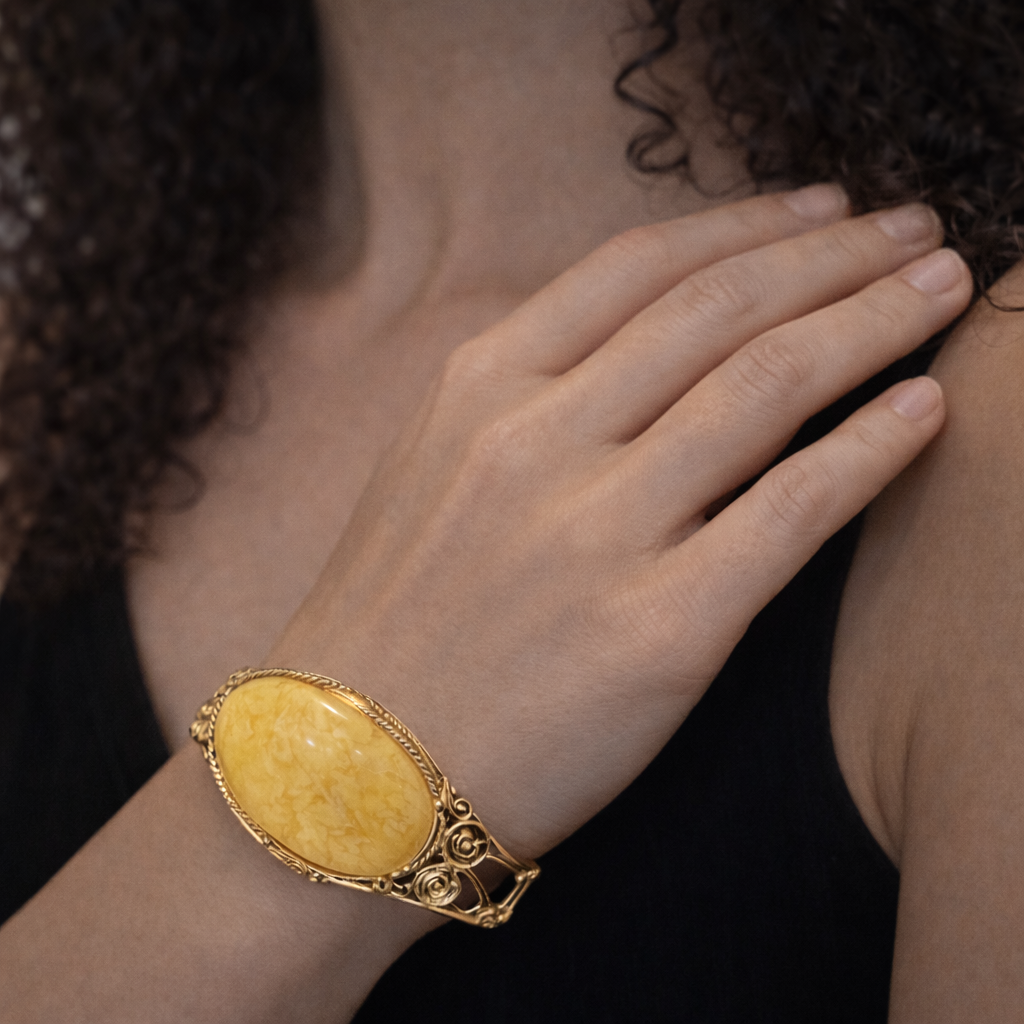 Wyjątkowa bransoleta o bogato zdobionej, artystycznej formie, której sercem jest duży, owalny kamień w ciepłym, miodowo-kremowym odcieniu. Jego gładko wypolerowana, lekko wypukła powierzchnia eksponuje naturalne, mleczne żyłkowania i subtelne przejścia barw, nadając całości szlachetnego, naturalnego charakteru.