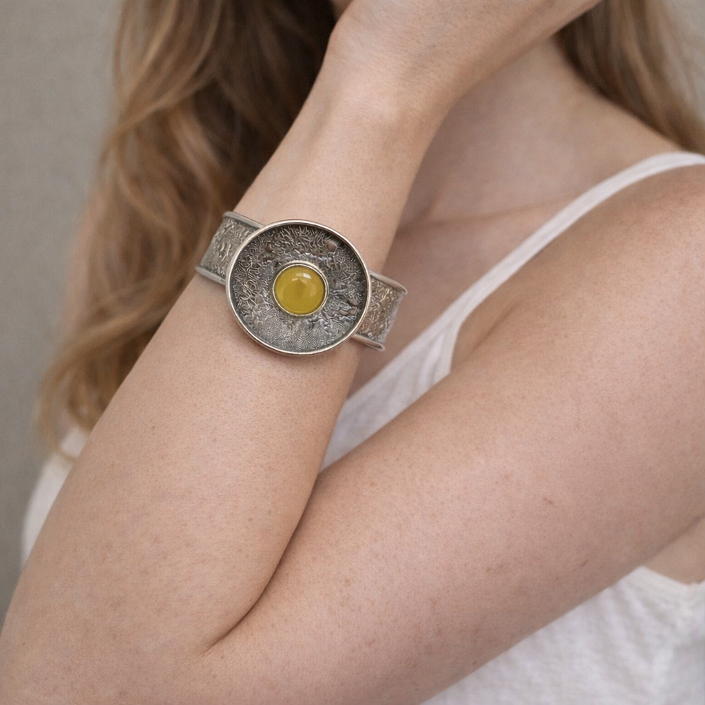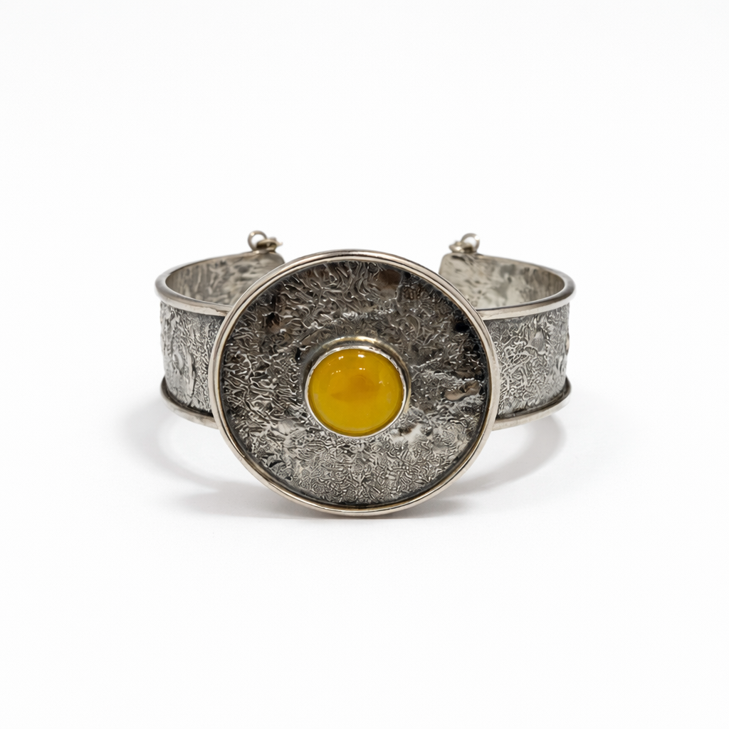 Wyrazista bransoleta o nowoczesnym, industrialno-artystycznym charakterze. Szeroka, masywna obręcz została ozdobiona fakturowaną powierzchnią przypominającą surową, ręcznie kutą metalową taflę. W centrum kompozycji znajduje się okrągły, wypukły kamień w intensywnym, miodowo-żółtym odcieniu, który tworzy mocny, świetlisty kontrapunkt dla chłodnego, srebrzystego metalu.