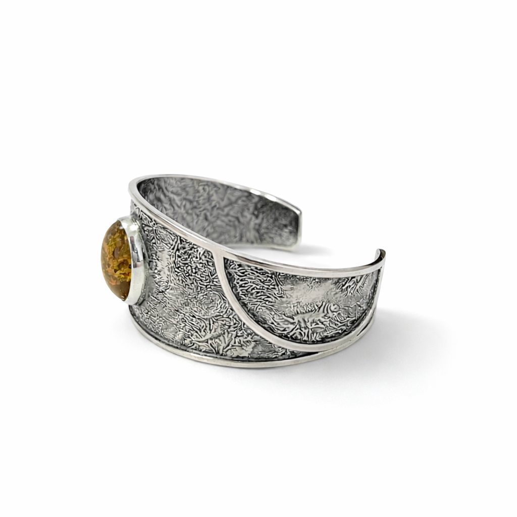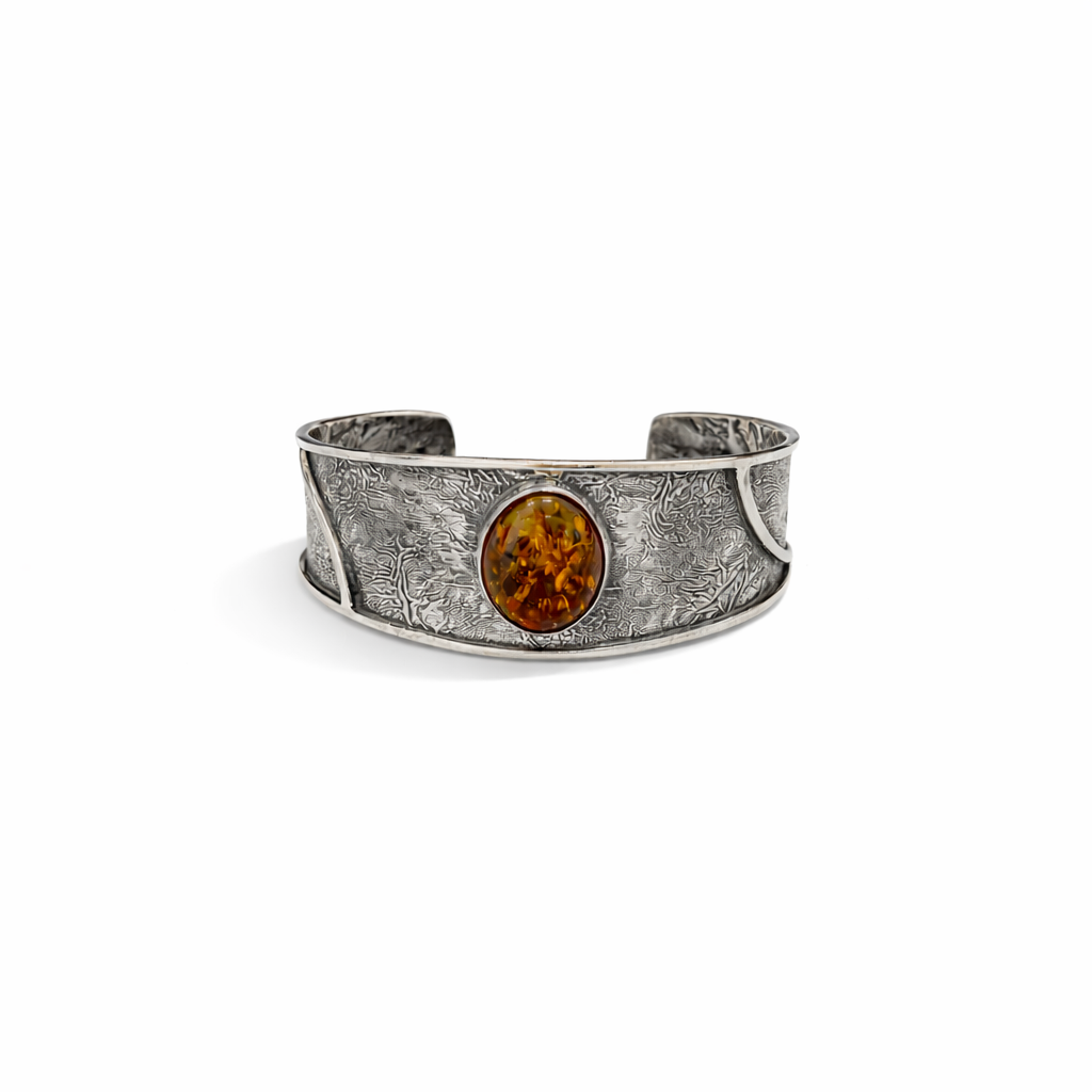 Efektowna bransoleta wykonana ze srebra, ozdobiona centralnie naturalnym bursztynem o ciepłej, miodowo-koniakowej barwie. Szeroka forma nadaje jej wyrazisty charakter, a dekoracyjna, fakturowana powierzchnia srebra pięknie kontrastuje z połyskiem bursztynu. To biżuteria, która przyciąga uwagę i doskonale sprawdzi się zarówno jako mocny akcent codziennej stylizacji, jak i jako dodatek do bardziej eleganckiego stroju.