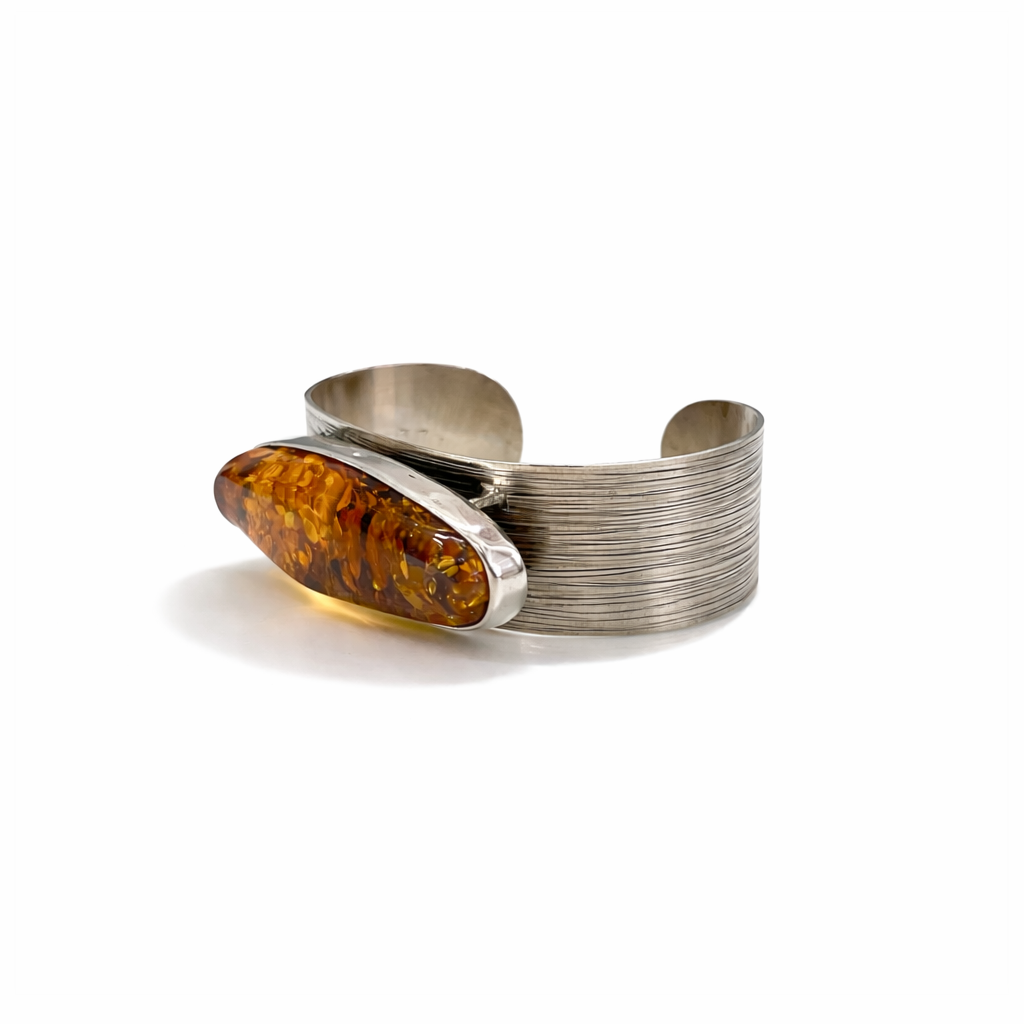 Nowoczesna i wyrazista bransoleta wykonana ze srebra, ozdobiona dużym, podłużnym bursztynem o ciepłej miodowo-koniakowej barwie. Minimalistyczna, szeroka forma srebra pięknie kontrastuje z naturalną strukturą bursztynu, tworząc elegancką, a zarazem artystyczną kompozycję. To biżuteria, która doskonale podkreśli indywidualny styl i stanie się mocnym akcentem każdej stylizacji.