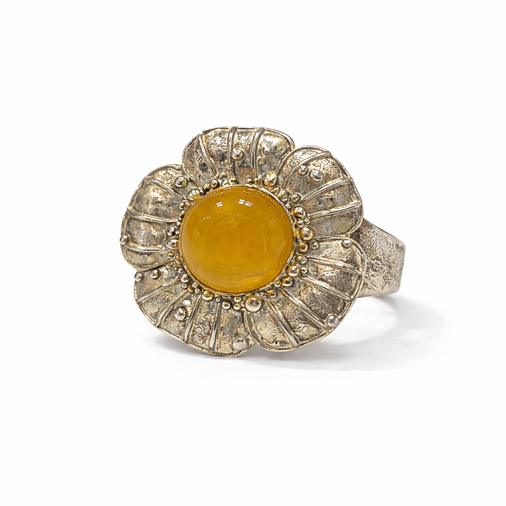 Efektowna bransoleta z okazałym elementem ozdobnym w formie kwiatu, wykonana z naturalnego bursztynu i srebra. Centralny motyw przyciąga uwagę ciepłą barwą bursztynu oraz bogatą, ręcznie opracowaną formą, która podkreśla unikatowy charakter biżuterii. Każdy detal został dopracowany z dbałością o estetykę i trwałość, dzięki czemu bransoleta stanowi wyrazisty, a zarazem elegancki dodatek.