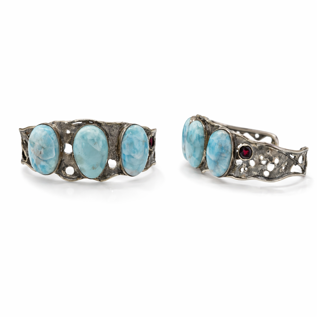 Artystyczna bransoleta wykonana z naturalnego larimaru, oprawionego w srebro, o wyrazistej, ażurowej formie. Kompozycję tworzą trzy owalne kamienie o jasnobłękitnej barwie z charakterystycznym, mlecznym rysunkiem, który nadaje biżuterii świeżości i naturalnej lekkości.