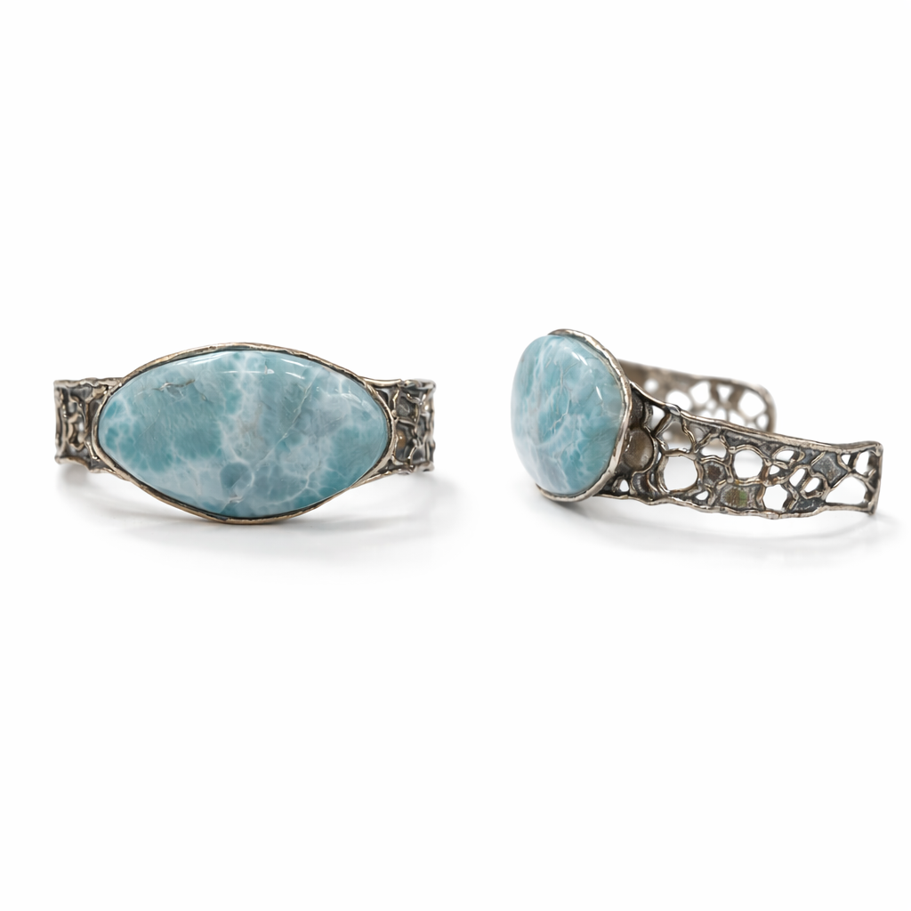 Efektowna, ręcznie wykonana bransoleta z naturalnym larimarem, kamieniem o hipnotyzującej, błękitno-białej strukturze kojarzącej się z morską taflą i karaibskim niebem. Centralnie osadzony, starannie wypolerowany kamień przyciąga wzrok swoją głębią koloru i naturalnym rysunkiem, dzięki czemu każda bransoleta jest jedyna w swoim rodzaju.