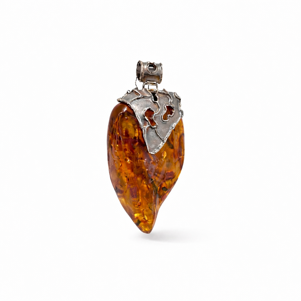 Elegancka, ręcznie wykonana zawieszka z naturalnego bursztynu oprawionego w srebro. Kamień ma ciepłą, miodowo-koniakową barwę z widocznymi, naturalnymi inkluzjami, które nadają mu głębi i niepowtarzalnego charakteru. Jego powierzchnia została starannie wypolerowana, dzięki czemu pięknie odbija światło i podkreśla organiczną strukturę bursztynu.