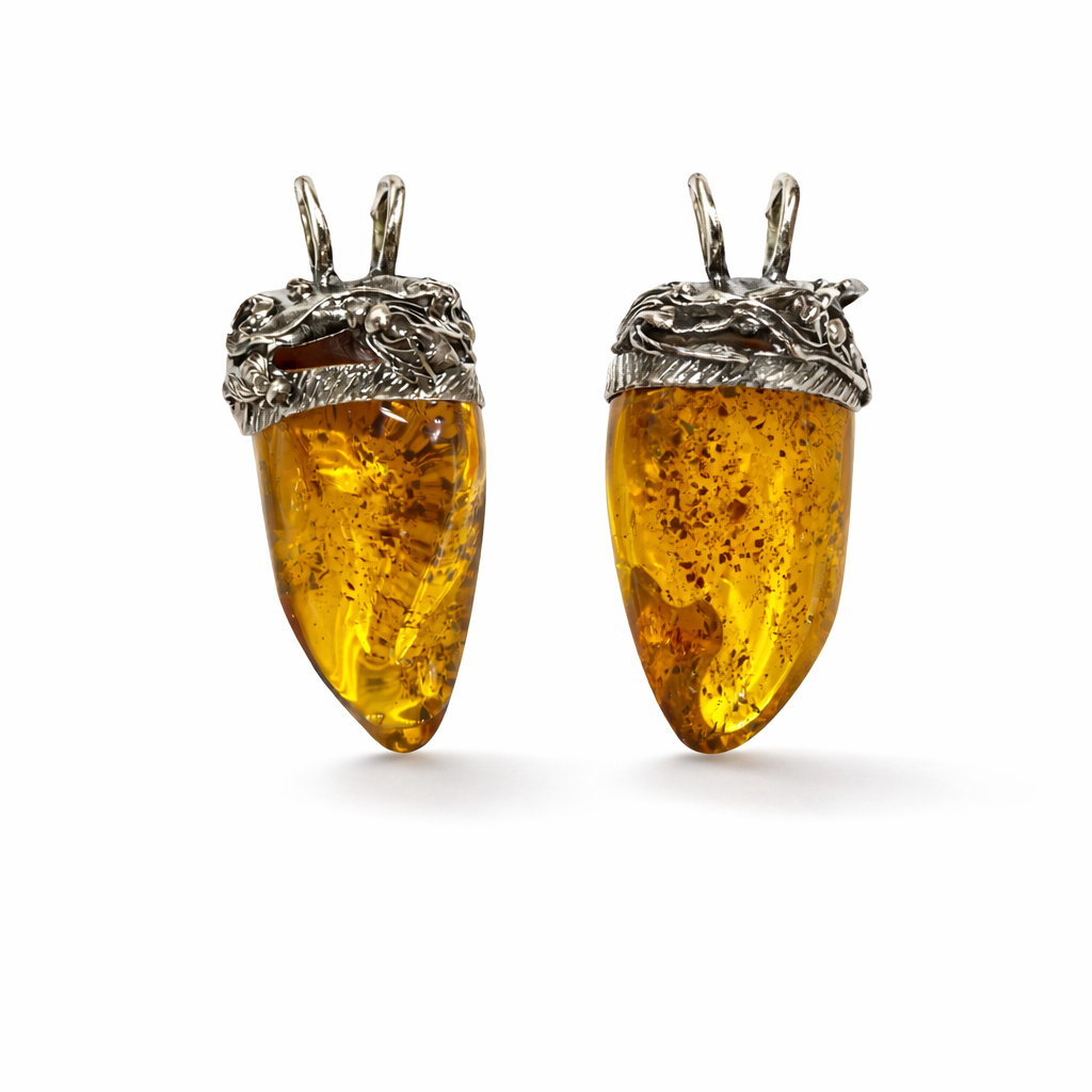 Elegancki wisiorek z naturalnego bursztynu, prezentowany na zdjęciu z dwóch stron – z przodu i z tyłu – aby w pełni ukazać jego unikalną strukturę oraz inkluzje zatopione wewnątrz kamienia. Bursztyn ma ciepły, miodowo-złoty odcień i został starannie wypolerowany, co podkreśla jego naturalny blask i głębię.