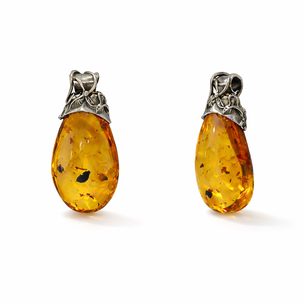 Elegancka zawieszka z naturalnego bursztynu w ciepłym, miodowo-koniakowym odcieniu, oprawiona w dekoracyjne srebro o roślinnym, finezyjnym wzorze. Wewnątrz kamienia widoczne są naturalne inkluzje, które podkreślają jego autentyczność i niepowtarzalny charakter – każdy egzemplarz jest jedyny w swoim rodzaju.
