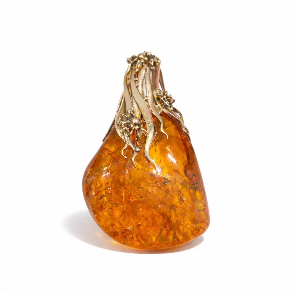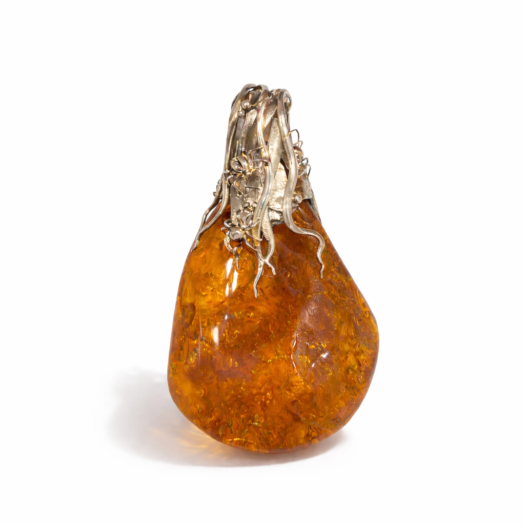 Bursztyn został oprawiony w misterną, ręcznie formowaną konstrukcję ze srebra, przypominającą organiczne pnącza oplatające kamień. Wśród falujących linii metalu ukryte są detalicznie wykonane motywy pająków, które dodają kompozycji intrygującego, nieco tajemniczego charakteru i podkreślają artystyczny, unikatowy styl biżuterii. Te drobne rzeźbiarskie elementy sprawiają, że zawieszka przyciąga uwagę nie tylko formą, ale i bogactwem symbolicznych detali.
