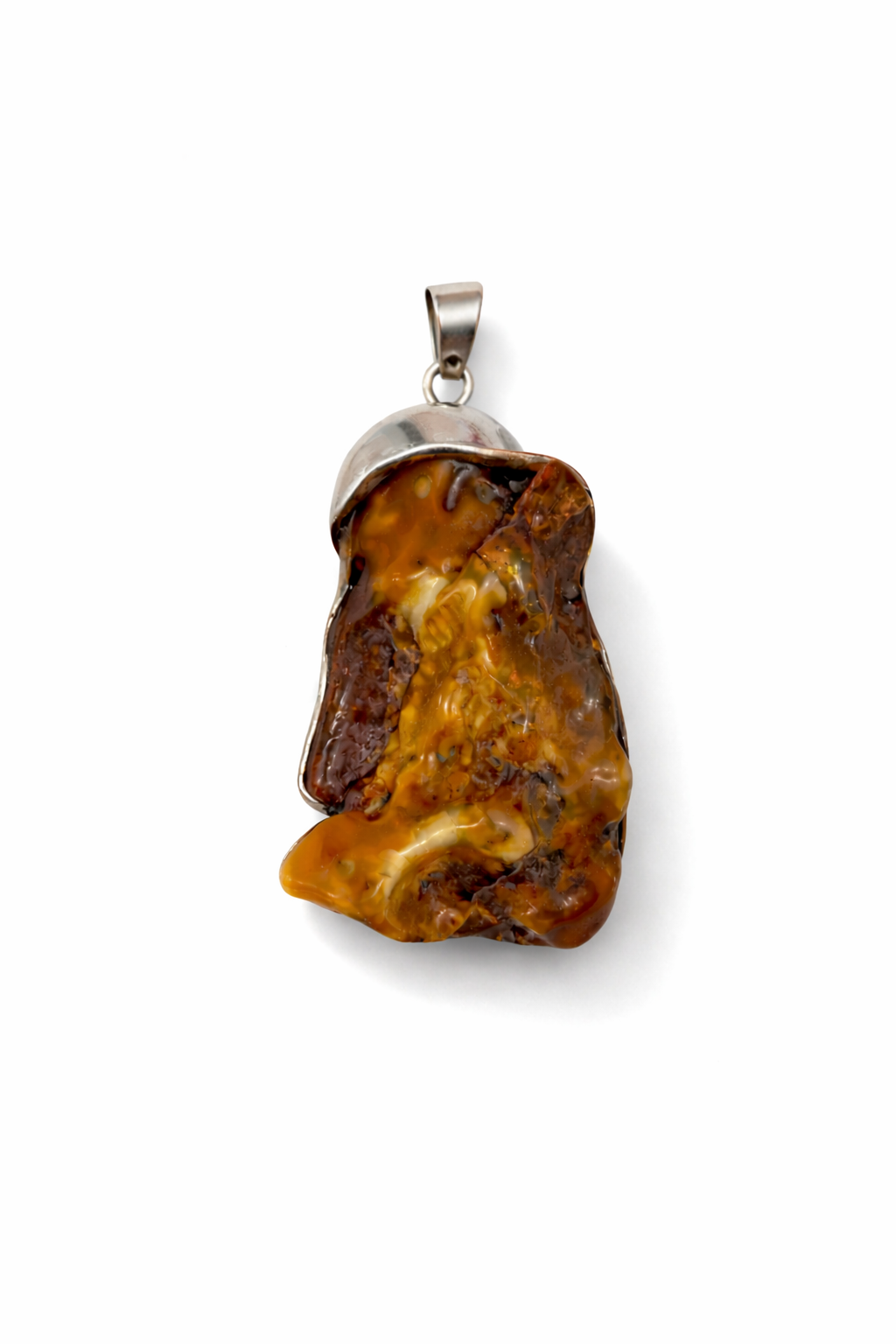 Wyrazista zawieszka wykonana ze srebra i naturalnego bursztynu, która zachowuje surowy, autentyczny charakter kamienia. Centralnym elementem jest nieregularny bursztyn w głębokich odcieniach miodu, koniaku i ciepłego brązu, z widocznymi naturalnymi strukturami i inkluzjami, które nadają mu wyjątkową głębię oraz niepowtarzalny rysunek.