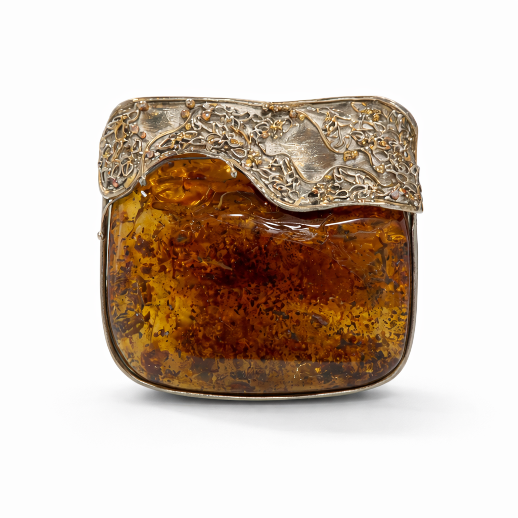 Bursztyn zwieńczony jest dekoracyjną, ręcznie formowaną oprawą ze srebra o organicznym charakterze. Górna część zawieszki przypomina falującą taflę metalu, bogato zdobioną misternymi motywami roślinnymi i drobnymi detalami jubilerskimi. Kontrast pomiędzy chłodnym, fakturowanym srebrem a ciepłym, transparentnym bursztynem nadaje całości wyjątkowy, kolekcjonerski charakter.