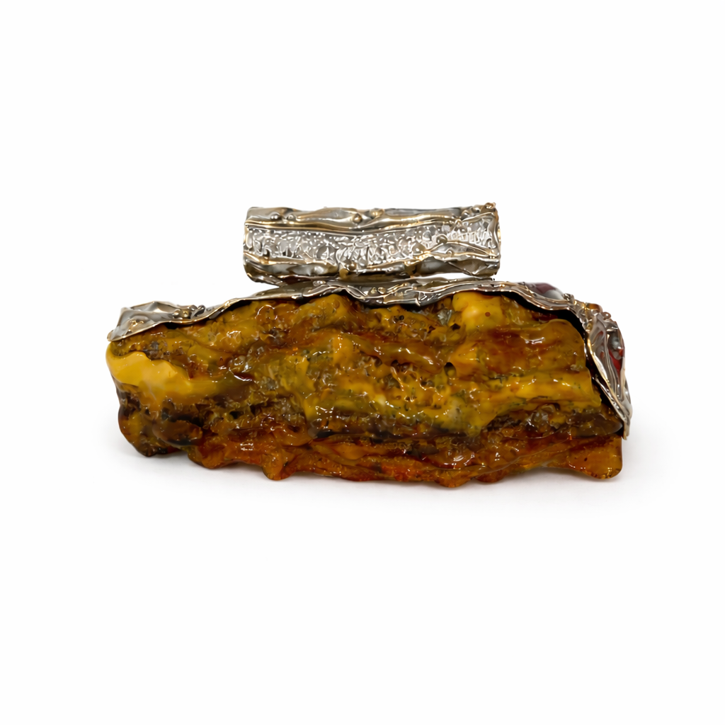 Wyjątkowa, masywna zawieszka z naturalnym bursztynem to propozycja dla osób ceniących biżuterię o niepowtarzalnym charakterze. Duży, surowy bursztyn zachwyca organiczną formą oraz bogactwem barw i naturalnych inkluzji, dzięki czemu każda sztuka jest jedyna w swoim rodzaju. Kamień został oprawiony w solidną, ręcznie wykończoną oprawę, która podkreśla jego naturalne piękno i nadaje całości artystyczny, wyrazisty styl.