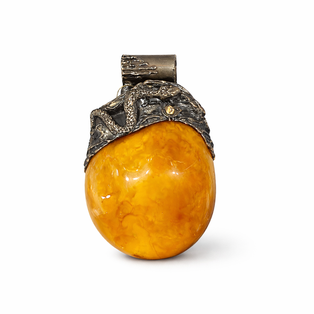 Bursztyn osadzony został w artystycznej oprawie ze srebra, wykonanej ręcznie z dbałością o detale. Oprawa przyjmuje formę wijącego się węża, który oplata kamień, nadając zawieszce symboliczny i nieco mistyczny charakter. Motyw węża od wieków kojarzony jest z ochroną, siłą i odrodzeniem, co dodatkowo podkreśla wyjątkowość tej biżuterii. Organiczne linie i rzeźbiarskie wykończenie srebra pięknie kontrastują z gładką powierzchnią bursztynu, tworząc spójną, artystyczną całość.
