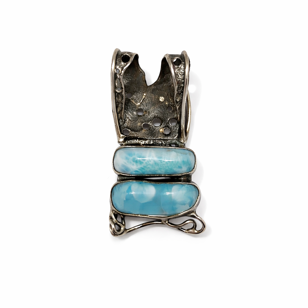 Wyjątkowa, ręcznie wykonana zawieszka z naturalnym larimarem, kamieniem cenionym za swój niepowtarzalny, błękitno-biały rysunek przywodzący na myśl spokojne morze i tropikalne niebo. Kompozycja składa się z dwóch starannie oszlifowanych kamieni, które harmonijnie współgrają z artystyczną, ażurową oprawą ze srebra.