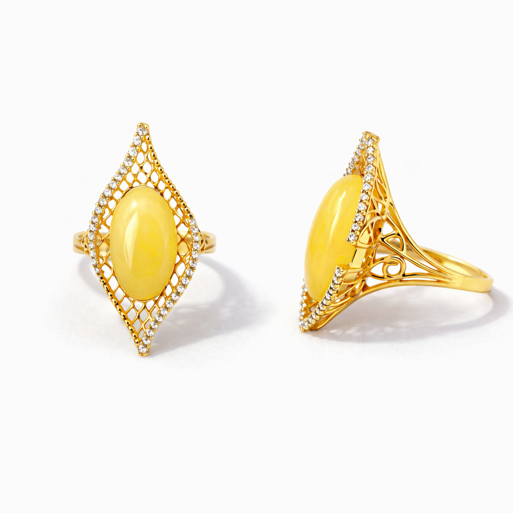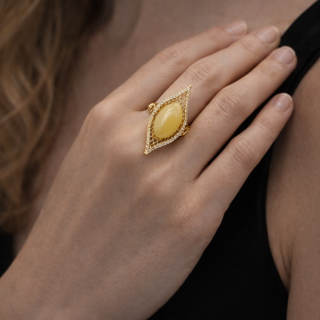 Elegancki, a zarazem efektowny pierścionek o wydłużonej, ażurowej formie, inspirowanej motywami geometrycznymi i roślinną lekkością. W centrum kompozycji znajduje się owalny kamień w ciepłym, cytrynowo-miodowym odcieniu, subtelnie półtransparentny i pięknie rozświetlający całą formę biżuterii. Otacza go misternie wykonana, złocista konstrukcja o siateczkowym wzorze, której krawędzie wysadzane są drobnymi, lśniącymi kamieniami, dodającymi całości blasku i elegancji.
