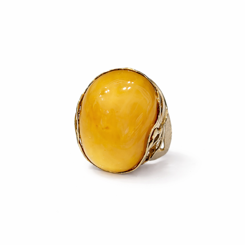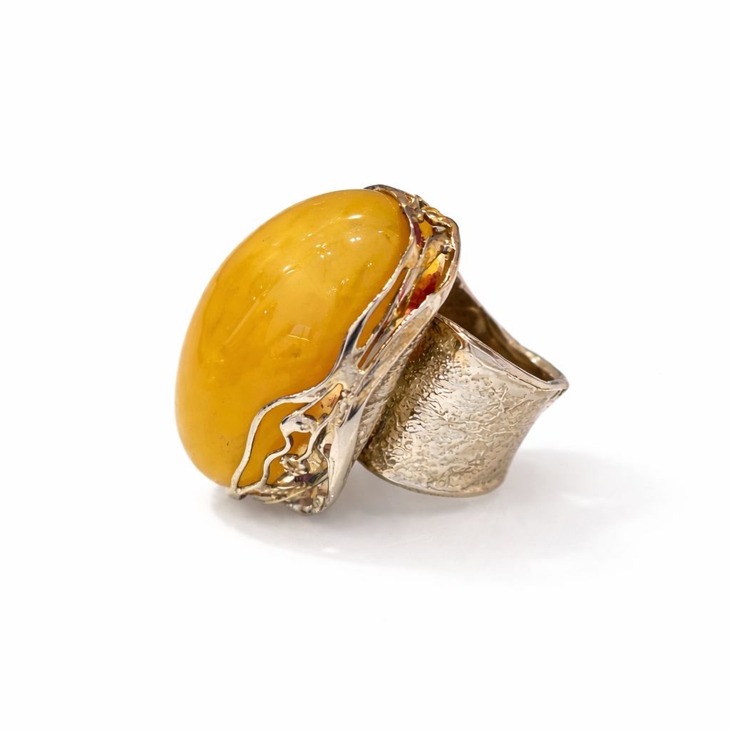 Efektowny pierścionek z naturalnym bursztynem, który przyciąga uwagę swoją wielkością i ciepłą, miodową barwą. Starannie oszlifowany bursztyn o organicznym charakterze został oprawiony w solidną, dekoracyjną oprawę, podkreślającą unikatowość kamienia. To biżuteria o wyrazistym stylu, idealna jako mocny akcent zarówno do codziennych stylizacji, jak i eleganckich zestawów.