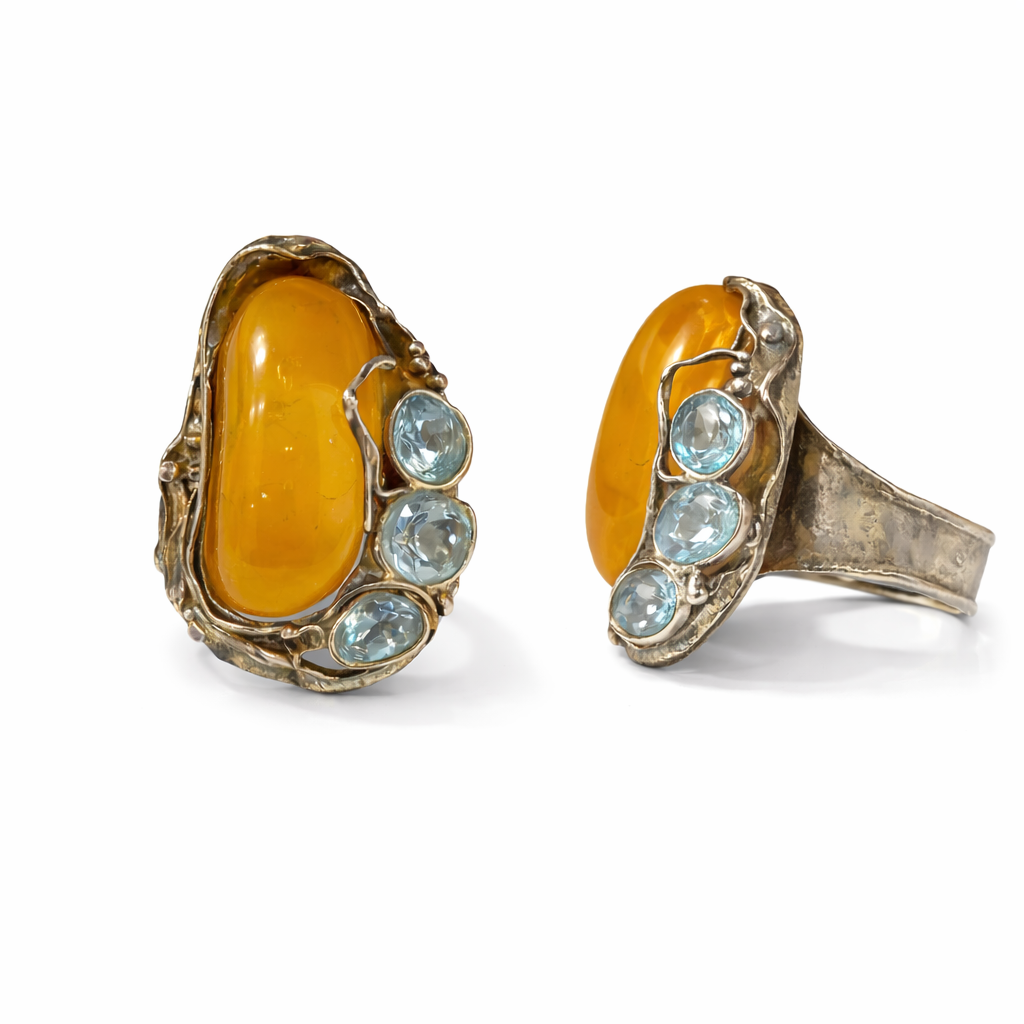 Bursztyn uzupełniają jasne, transparentne kamienie w chłodnym, błękitnym odcieniu, które subtelnie rozświetlają całość i tworzą efektowny kontrast z ciepłą barwą kamienia głównego. Srebrna oprawa o nieregularnej fakturze i płynnych liniach podkreśla rękodzielniczy charakter biżuterii, nadając jej unikatowy i szlachetny wygląd.