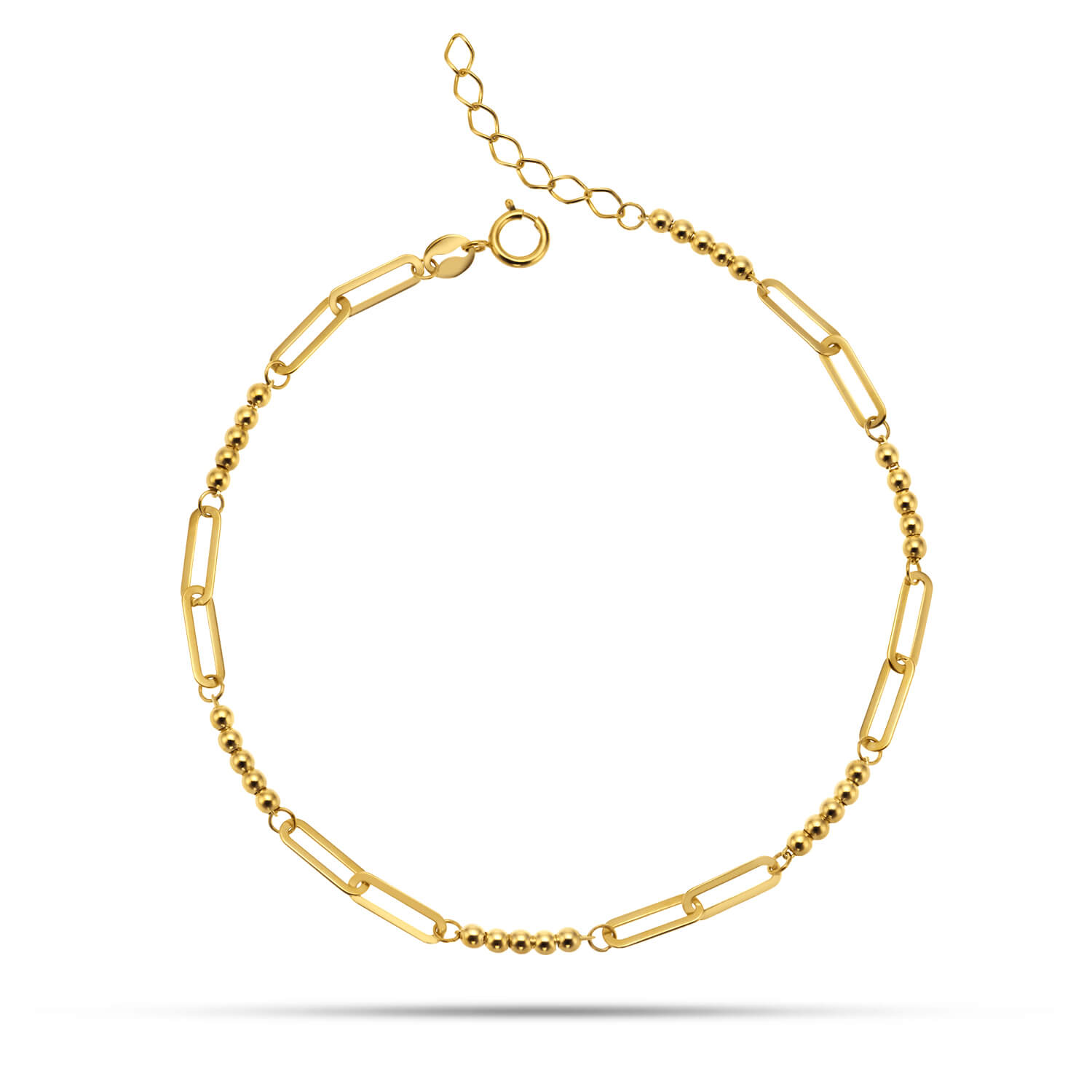 Złota bransoletka 585 z kolekcji SIGNATURE to esencja współczesnej elegancji. Delikatne, gładkie kulki (średnica 2 mm) pięknie kontrastują z wydłużonymi, geometrycznymi ogniwami, tworząc harmonijny wzór. Wykonana z żółtego złota próby 585, z możliwością regulacji długości od 17,5 do 19,5 cm. To biżuteria idealna dla kobiet, które wybierają wyrafinowaną prostotę i ponadczasowy styl.