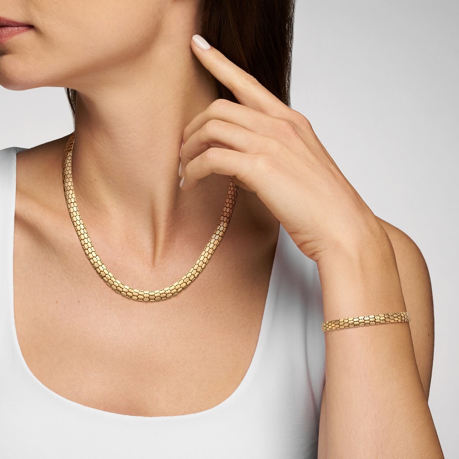 Bransoletka SIGNATURE wykonana z żółtego złota próby 585 to manifest nowoczesnego luksusu. Jej struktura oparta na grubych, gładkich ogniwach tworzy efekt płynnego światła i szlachetnej masy. Bez kamieni, bez kompromisów – czysta forma w najlepszym wydaniu. Długość 19 cm zapewnia doskonałe dopasowanie i komfort noszenia. To model, który nie potrzebuje towarzystwa – ale idealnie komponuje się z kolią z tej samej serii.