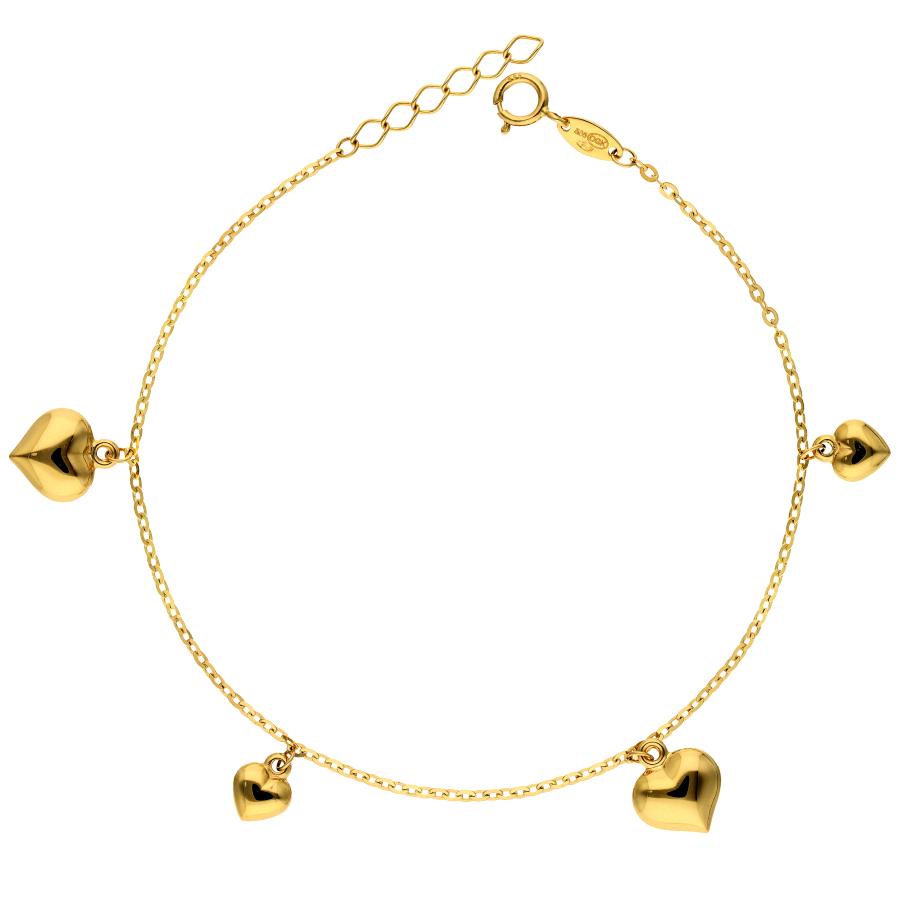 Wysokogatunkowa, efektownie błyszcząca, o naturalnej barwie – złota bransoletka celebrytka z pięknie diamentowanym łańcuszkiem (ankier) z gładkimi serduszkami rozłożonymi na całej długości 19 cm z możliwością regulacji za pomocą przedłużki do 17,5 cm.