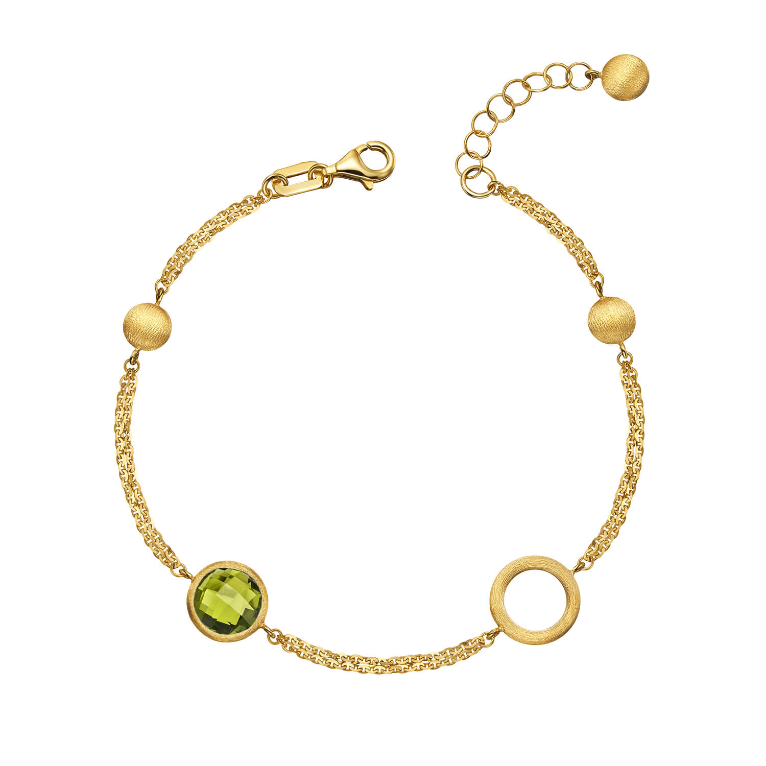 Złota bransoletka z kolekcji Prestige z syntetycznym Oliwinem efektownie prezentująca się, o naturalnej barwie – bransoletka złota zbudowana z pustych matowych okręgów i kółka. Bransoletka z żółtego złota na podwójnym łańcuszku o splocie ankier. Zapięcie bransolety typu karabinek, długość bazy 18 cm, z dołączoną przedłużką 2,5 cm.