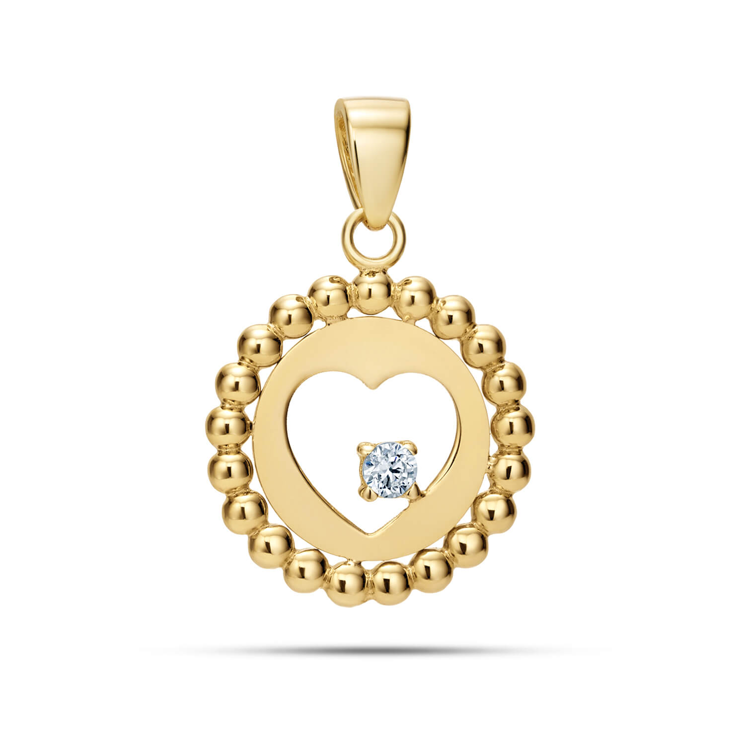 Subtelna zawieszka w kształcie serca, otoczona gładkimi, lśniącymi kuleczkami i ozdobiona połyskującą cyrkonią. Wykonana z żółtego złota próby 585, symbolizuje miłość, bliskość i ciepło. Idealna jako prezent „od serca” – dla ukochanej osoby lub dla siebie samej.