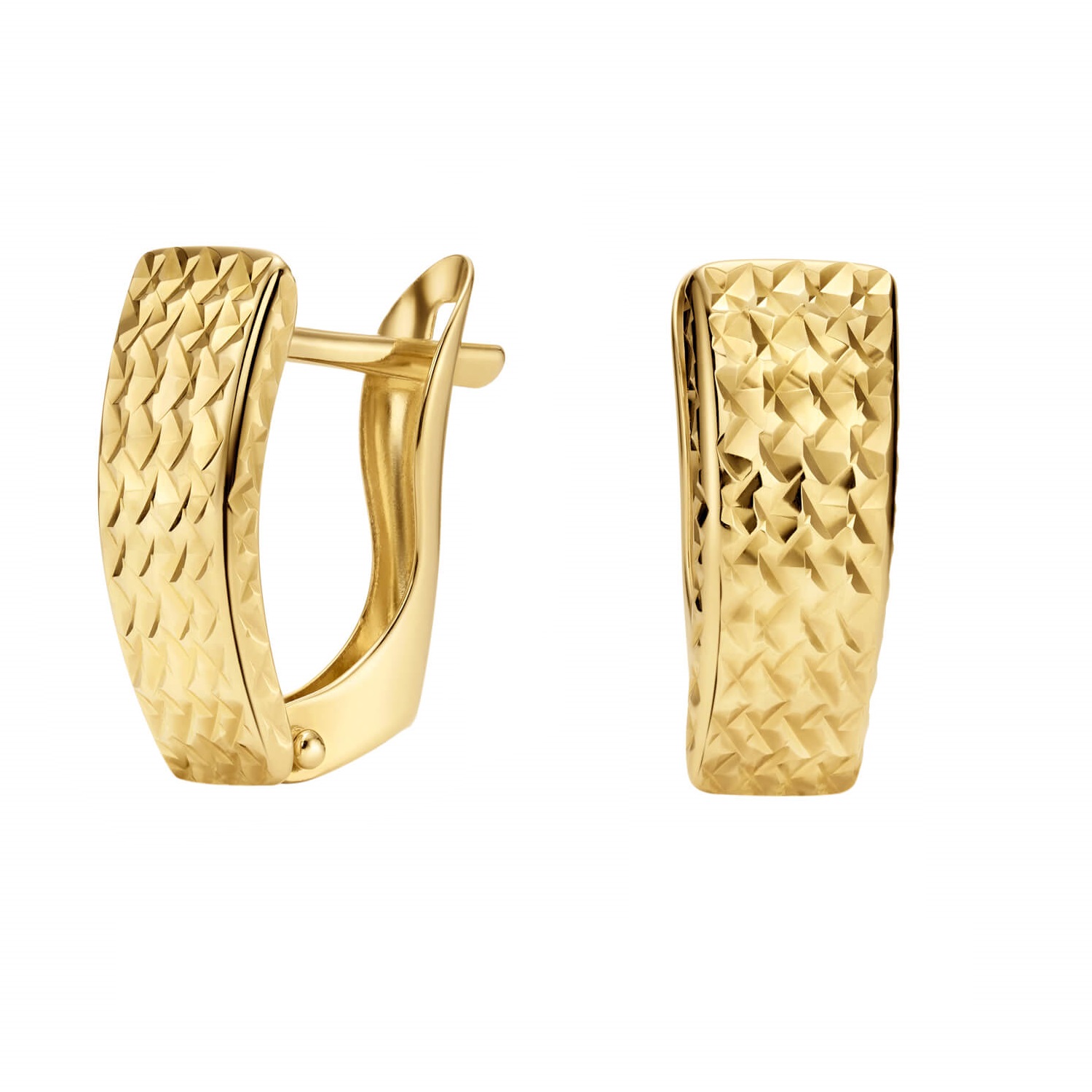 Złote kolczyki 585 z kolekcji BASIC to doskonały wybór dla kobiet ceniących subtelną elegancję i ponadczasowy styl. Precyzyjnie diamentowana powierzchnia pięknie odbija światło, tworząc efekt iskrzących refleksów. Dzięki kompaktowej długości 1,4 cm i klasycznemu zapięciu angielskiemu, kolczyki są wygodne w codziennym noszeniu i znakomicie sprawdzą się zarówno w casualowych, jak i eleganckich stylizacjach.