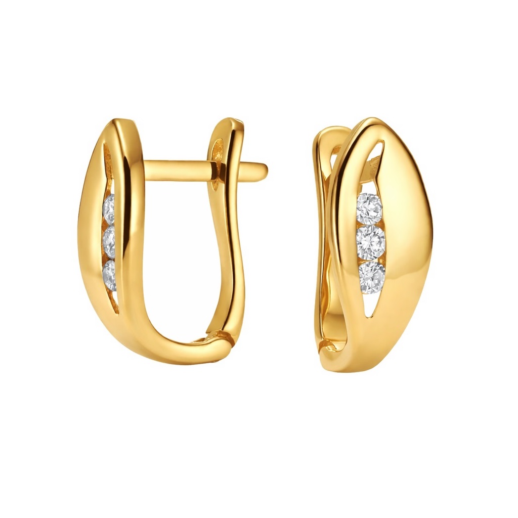 Złote kolczyki angielskie z brylantami JE9833 Y to elegancka ozdoba dla kobiet, która posiada lekko zakrzywiony, łezkowaty kształt. W środkowej części kolczyka znajduje się przestrzeń z osadzonymi brylantami. Łącznie zastosowano 6 sztuk kamieni szlachetnych, po 3 w każdym elemencie (ich łączna masa wynosi 0,15 CT). Kolczyki mają gładkie, błyszczące wykończenie, które podkreśla ich luksusowy charakter. Precyzyjnie ułożone diamenty, jeden pod drugim, cechują się klasą barwy G i czystością na poziomie SI.