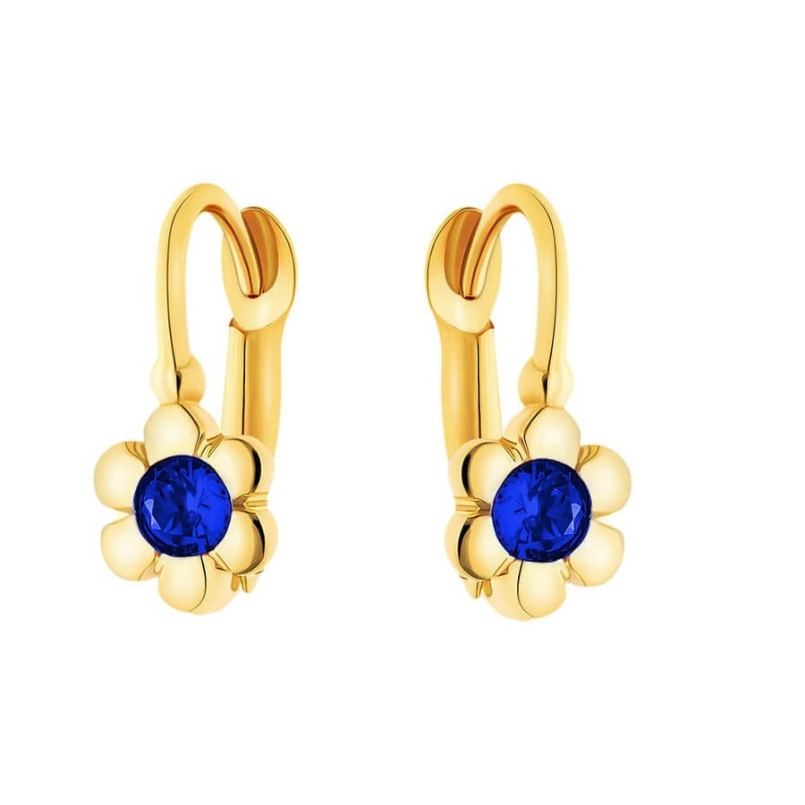 Złote kolczyki dziecięce złoty kwiatek z granatową cyrkonią