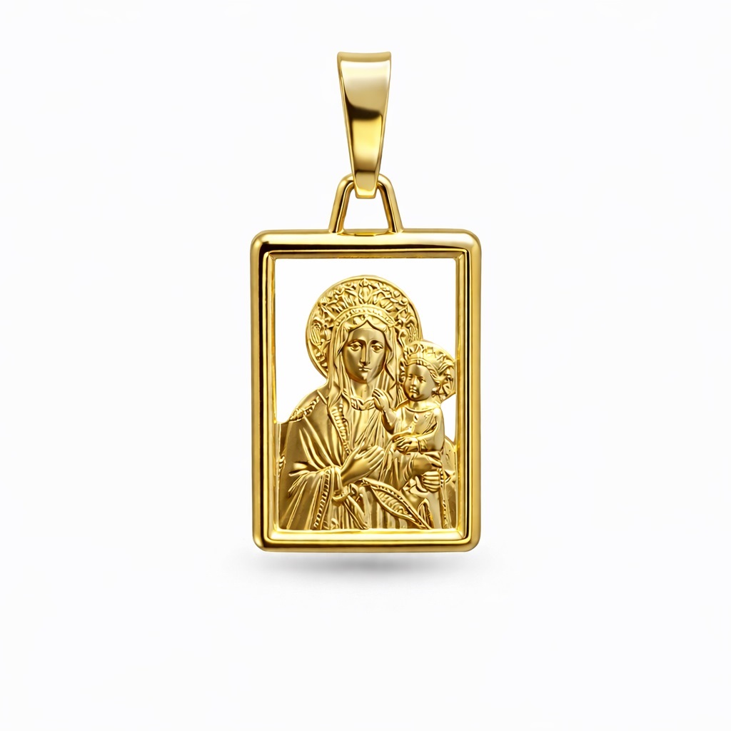Złoty medalik w prostokątnej oprawie z wizerunkiem Matki Boskiej Częstochowskiej- M