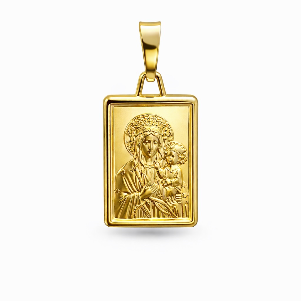 Elegancki złoty medalik w klasycznym kształcie prostokątu z wizerunkiem Matki Boskiej Częstochowskiej z Dzieciątkiem, wykonany ze złota próby 585. Centralna płaskorzeźba przedstawia charakterystyczny wizerunek Czarnej Madonny, ukazanej w półprofilu, z wyraźnie zaznaczonymi detalami twarzy, szat oraz symbolicznych blizn. Tło medalika zostało ozdobione promienistym grawerunkiem, który tworzy efekt świetlistej aureoli i nadaje kompozycji głębi oraz eleganckiego blasku. Obramowanie z drobnych, regularnych kuleczek podkreśla dekoracyjny charakter zawieszki, zachowując jednocześnie klasyczną, sakralną estetykę. Gładka, polerowana powierzchnia pięknie odbija światło, a solidna, starannie wyprofilowana zawieszka zapewnia komfortowe i bezpieczne noszenie na łańcuszku. Motyw Matki Boskiej Częstochowskiej symbolizuje opiekę, ochronę i wiarę, czyniąc medalik doskonałym wyborem na prezent z okazji chrztu, pierwszej komunii, bierzmowania lub jako osobistą pamiątkę o szczególnym znaczeniu duchowym.