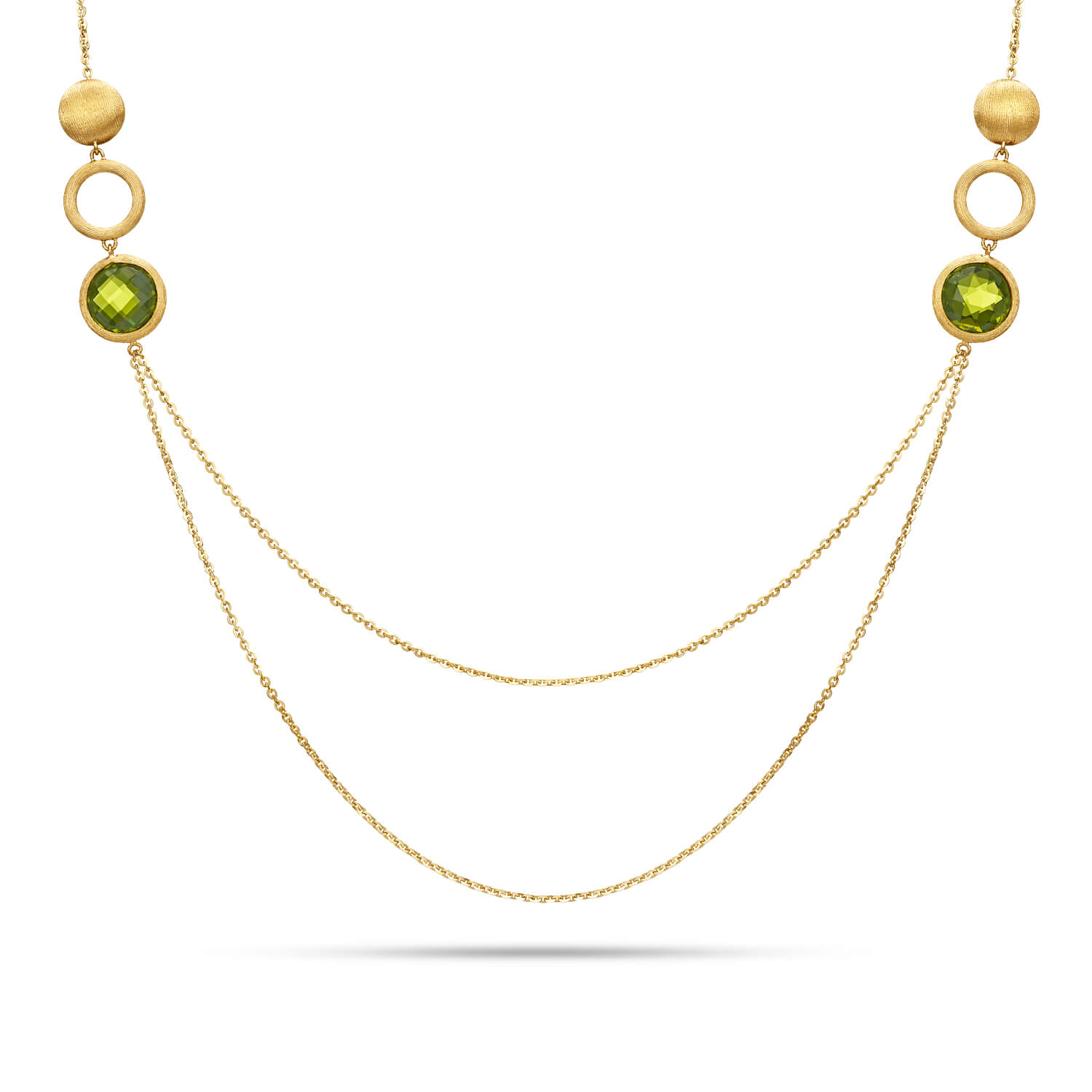 Efektownie prezentujący się, o naturalnej barwie – złoty naszyjnik z syntetycznym Oliwinem oraz kółkami w wykończeniu matowym. Naszyjnik z podwójnym łańcuszkiem o splocie ankier, z zapięciem typu karabinek, o długości 45 cm, z dodatkową przedłużką 3 cm.