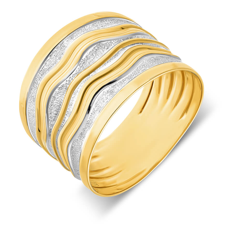 Złoty pierścionek szeroki fale biało-żółte