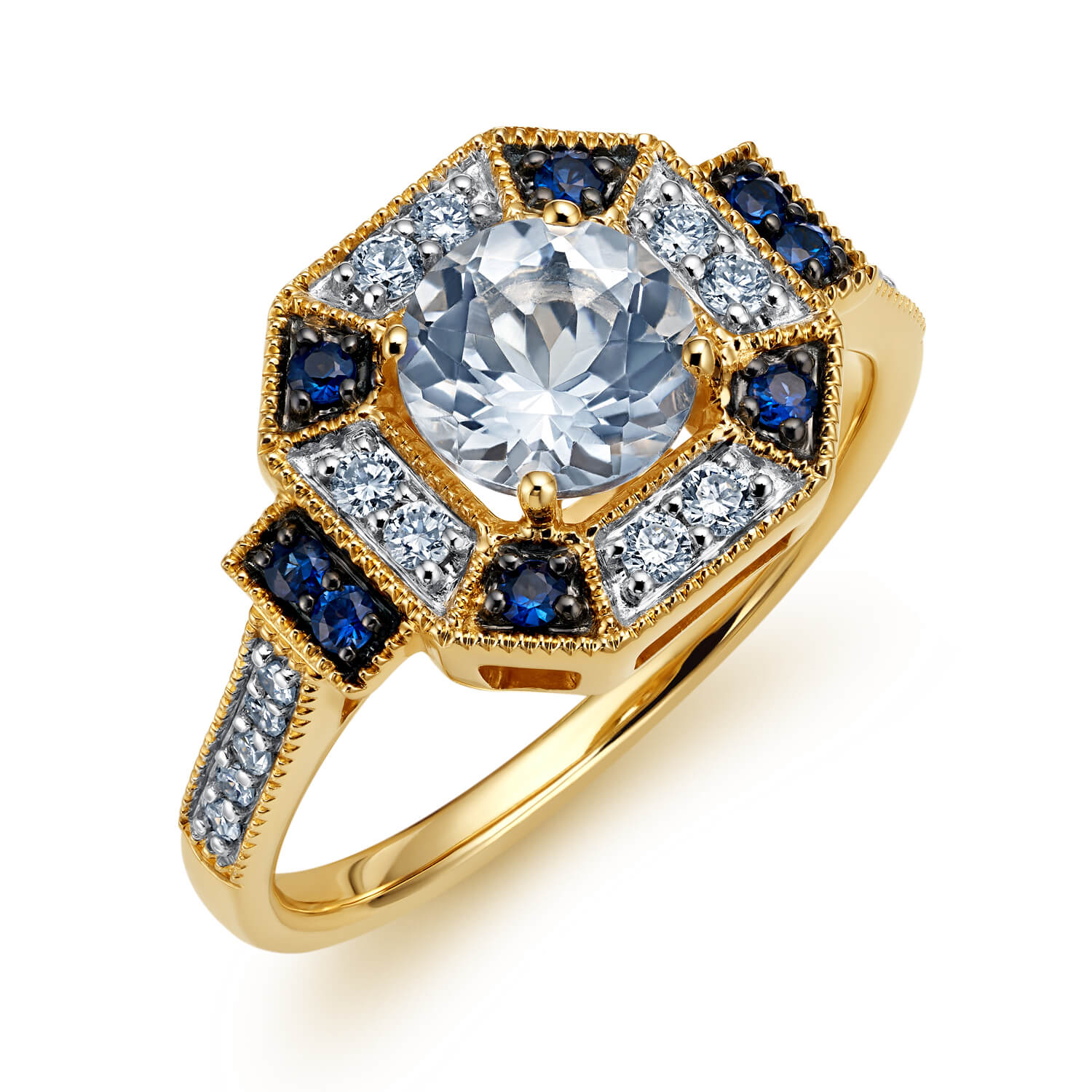 Złoty pierścionek z brylantami, białym topazem i szafirami RR52226SAPTOPY