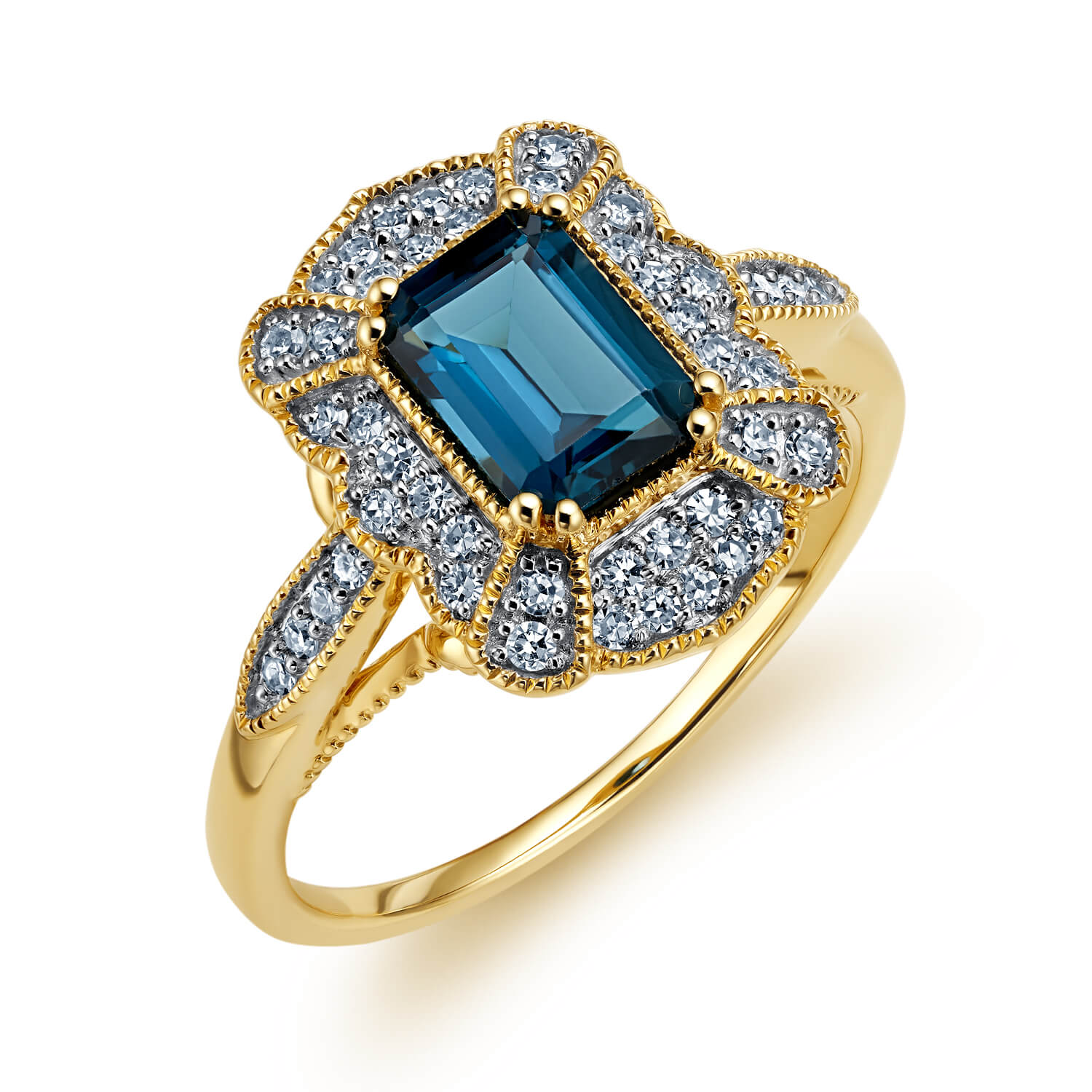 Złoty pierścionek z brylantami i london blue topaz JR18091LBTY