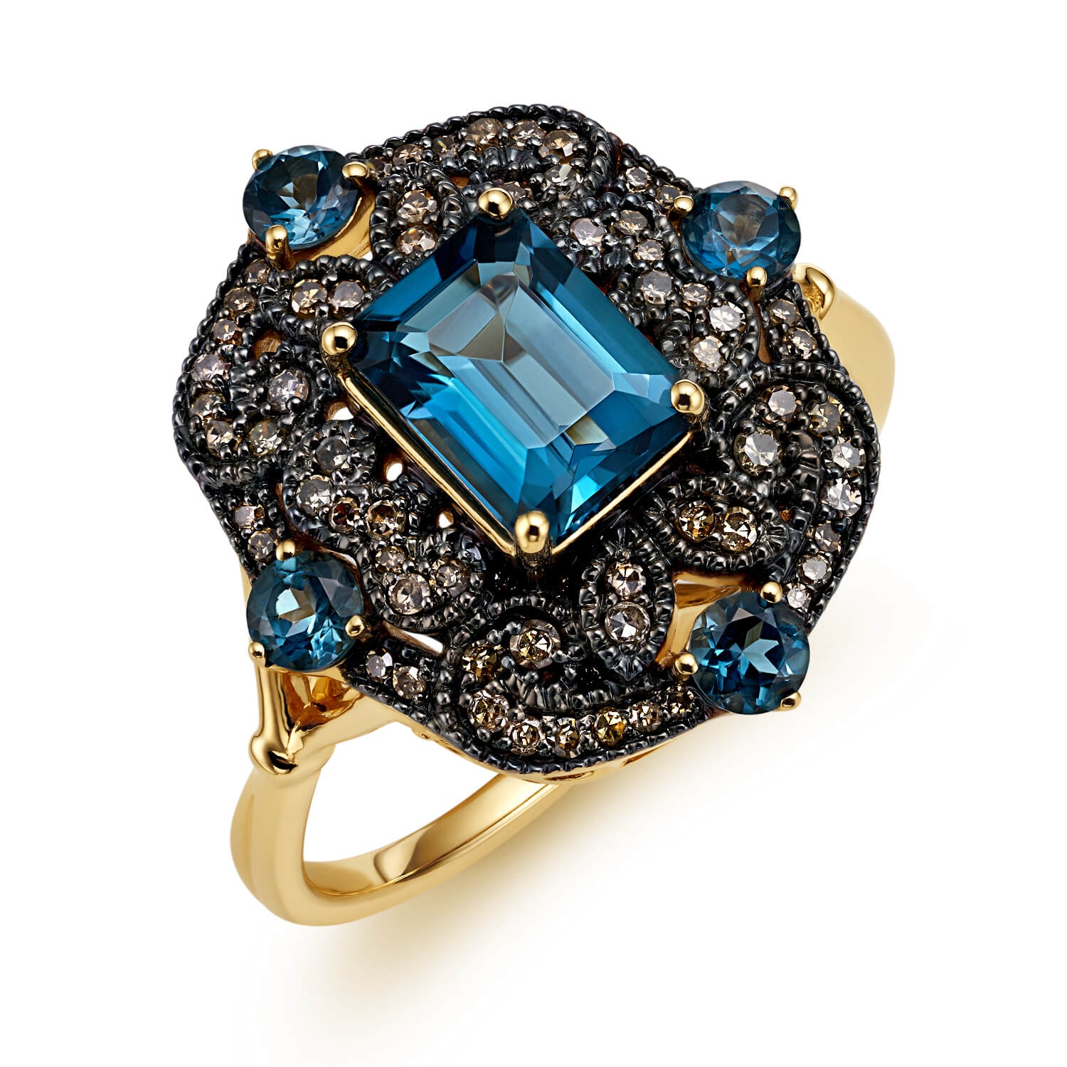 Złoty pierścionek z brylantami i London Blue topazem RR52372LBTY – luksusowe rzemiosło w stylu vintage